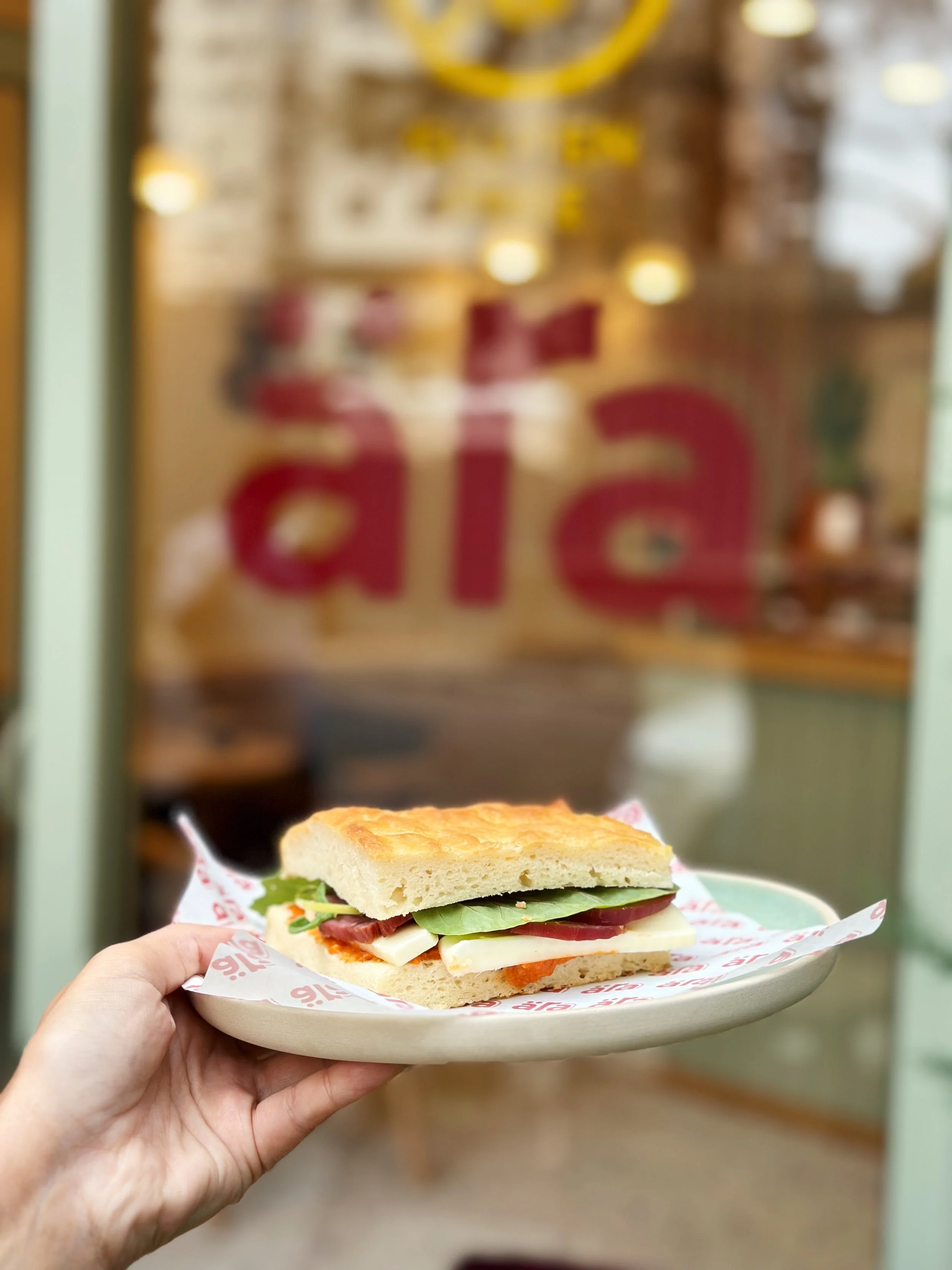 A hand holding a plate with a sandwich near a glass door with the red Subway logo on it.